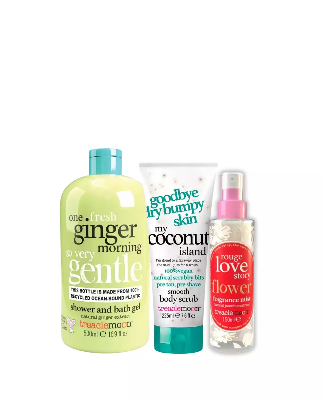 Paketissa Treaclemoon One Ginger Morning Shower Gel 500ml, Treaclemoon My Coconut Island Body Scrub 225ml ja Treaclemoon Rouge Love Story Body Spray 150ml.