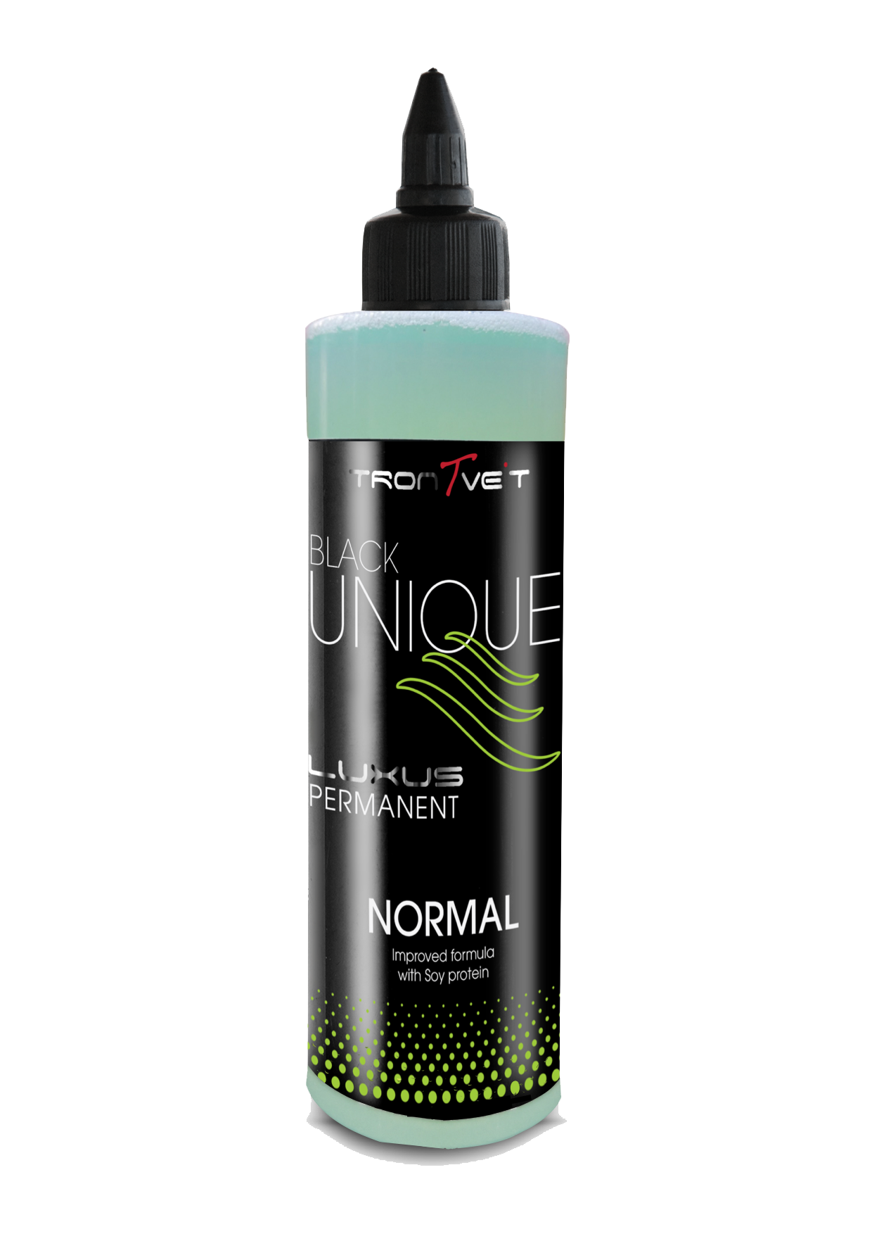 Permanenttiaine. Ainutlaatuinen seos, joka sisältää hydrolysoitua soijaproteiinia. Soijaproteiini kosteuttaa hiuksia niin, että kiharat pysyvät napakkana ja hiukset terveinä. Käyttämällä kysteamiinia perinteisen ammoniakin ja tioglykolihapon sijasta hiusten vahingoittuminen on merkittävästi vähentynyt, Trontveitin black Unique antaa täydellisen tuloksen joka kerta