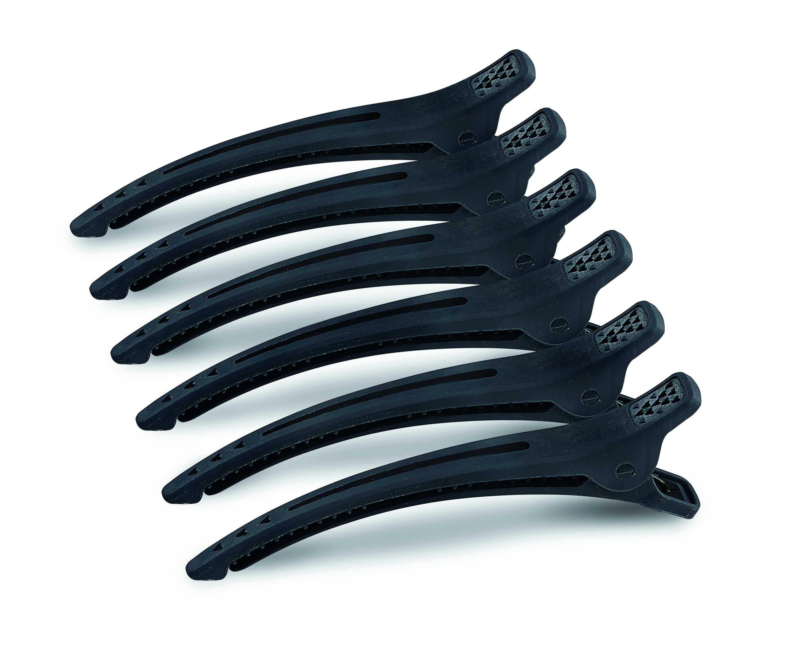 Musta hiusklipsi. 6kpl. Pituus 12cm. Värinkestävät tahroja hylkivät erotusklipsit tarjoavat erinomaisen otteen hiuksista, silikonisen liukuestenauhan ansiosta. Erittäin vahva jousi antaa tukevan pidon myös pitkäaikaisen käytön jälkeen. Keskipaksuille ja hienoille hiuksille.