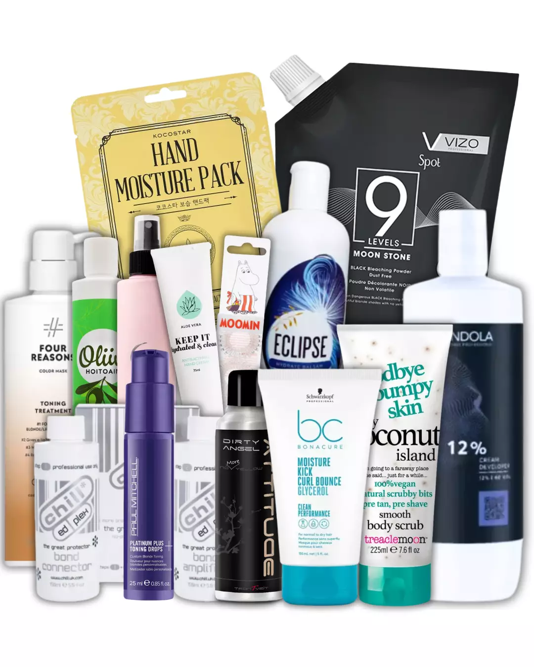 Paketissa: Capelli vaalennusjauhe 500g, Chill Ed Plex Mini Intro 150ml, Four Reasons Color Mask Toning Treatment Caramel 500ml, Moomin Hair Ring Transparent, Treaclemoon My Coconut Island Body Scrub 225ml, Paul Mitchell Platinum Plus Toning Drops 25ml, Bonacure Moisture Kick Curl Bounce 150ml, Lhb Care Spray 250ml, Oliivi Hoitoaine 250ml, Eclipse Hydra hoitoaine 300ml, KEEP IT Hand Cream Aloe Vera 75ml, Trontveit Attitude No More Yellow Dirty Angel 200ml, Indola Cream Developer 12% 1000ml ja Kocostar Hand Moisture pack.